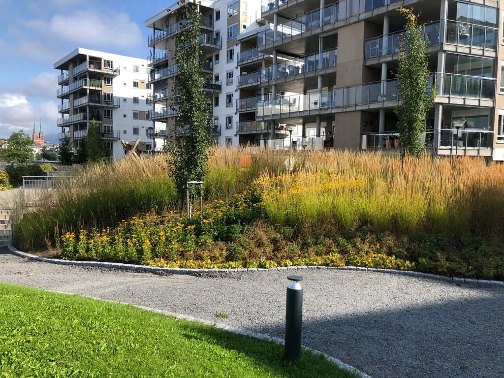 Vi har også bidratt med utarbeidelsen av utomhusplanen for Byggetrinn 5, på rammesøknadsnivå. Dette inkluderer et parkområde der vi har foreslått tiltak som fremmer biologisk mangfold, og terrenget er utformet på en gjennomtenkt og estetisk måte. Her har vi samarbeidet med Betonmast og Spir Arkitektur.